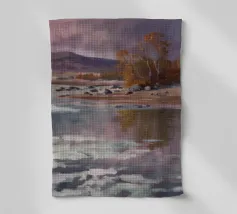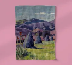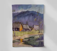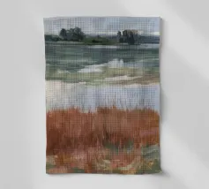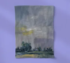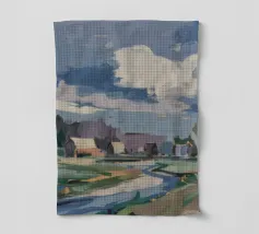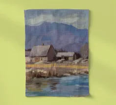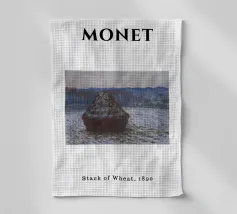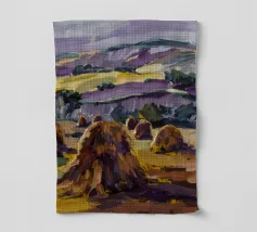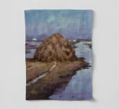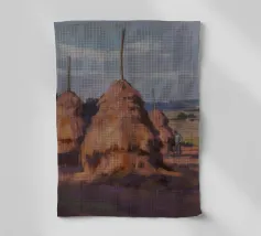 Un dipinto di paesaggio con un grande pagliaio in un campo vicino a un fiume o a uno specchio d'acqua tranquillo. Il cielo è di un grigio tenue e coperto, e la tavolozza generale è sobria con toni terrosi.