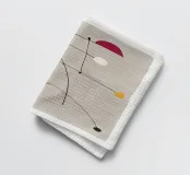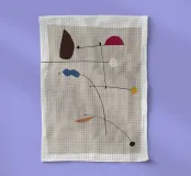 Le forme astratte sono collegate da sottili linee nere su uno sfondo beige chiaro, creando un senso di equilibrio. La composizione presenta varie forme geometriche in diversi colori, tra cui marrone, rosso, blu, bianco e giallo.
