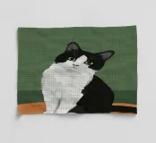 Un bel gatto tuxedo bianco e nero siede in una posizione composta ed elegante, guardando direttamente l'osservatore con un'espressione calma e gentile, catturata in un ritratto semplice e bello.