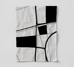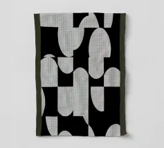 Audaci motivi geometrici si intrecciano con un sorprendente accento giallo in un design che enfatizza il contrasto. Le forme curve e angolari in bianco e nero creano un flusso visivo dinamico.