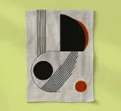 Forme e linee geometriche in nero e arancione creano un armonioso disegno astratto. L'equilibrio di semicerchi, cerchi e linee crea una composizione dinamica ma minimalista. Lo sfondo neutro esalta il contrasto tra i colori e le forme più vivaci.
