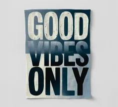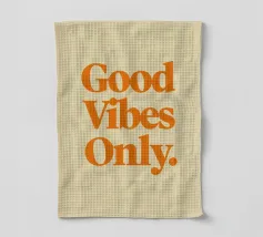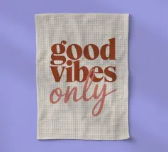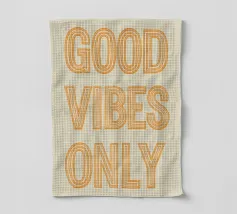 Un messaggio luminoso ed edificante per una casa felice. Questa scritta a mano riporta la classica frase "GOOD VIBES ONLY" su un allegro sfondo a righe.