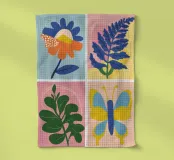 Un'affascinante griglia di quattro illustrazioni presenta un fiore, una felce, delle foglie e una farfalla, creando un bellissimo studio botanico in stile didattico.