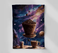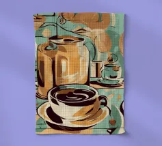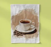 Una tazza di caffè nero su un piattino, circondata da chicchi di caffè sparsi - raffigurata in toni beige morbidi e caldi dal carattere pittoresco. L'immagine emana calma, concentrazione e piacere aromatico. Perfetto per gli amanti del caffè, per l'arredamento dei bar o per gli spazi di lavoro che hanno bisogno di promuovere un ambiente calmo ma elegante.