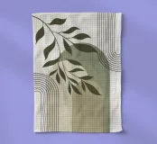 Un ramo di foglie si sovrappone a forme geometriche, tra cui linee arcuate e toni sfumati e stratificati. La combinazione crea un connubio armonioso tra natura e design astratto.