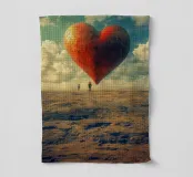 Un cuore colossale e consumato dalle intemperie fluttua serenamente sopra un vasto paesaggio incrinato, simbolo potente di un amore duraturo in un mondo desolato. Due piccole figure si ergono al suo cospetto, aggiungendo la scala epica e l'atmosfera cinematografica di questa opera d'arte surreale. Con i suoi toni vintage e le sue immagini che fanno riflettere, quest'opera è un invito alla conversazione e un tributo al grande viaggio dell'amore.