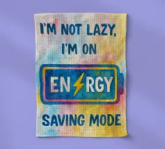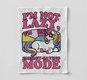 Un unicorno colorato con una criniera arcobaleno si trova sotto la frase "Non sono pigro, sono in modalità risparmio energetico" in lettere rosa. Lo sfondo è caratterizzato da un blocco di colori pastello che esalta il tema giocoso e stravagante.
