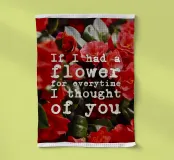 Una poesia visiva di colori ed emozioni: fiori rossi brillanti su uno sfondo verde lussureggiante fanno da sfondo alla scritta bianca "If I had a flower for everytime I thought of you" (Se avessi un fiore per ogni volta che ho pensato a te), una frase che oscilla come un pensiero silenzioso tra nostalgia e affetto. La composizione vive del contrasto tra l'intensità floreale e la chiarezza tipografica. Sembra un momento catturato, personale e universale allo stesso tempo.