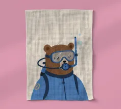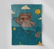 Simpatico orso con occhiali da sub che nuota nel mare. Scena subacquea giocosa con coralli e stelle marine. Perfetto per disegni per bambini, prodotti estivi e illustrazioni marittime.Orso allegro con maschera da snorkeling Mondo sottomarino colorato con sole Design infantile e giocoso Ideale per motivi estivi, marini e animali Perfetto per poster, abbigliamento...