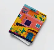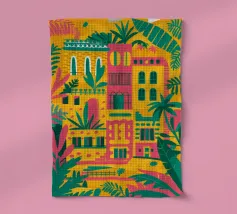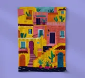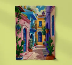 Un'illustrazione vibrante e dettagliata di una città collinare simile a un labirinto, con case colorate, scale e piante ovunque. La scena è una rappresentazione gioiosa, energica e complessa di una vivace comunità mediterranea.
