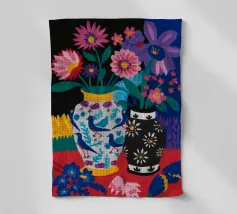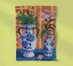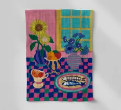 Una natura morta moderna ed eclettica con un paralume a scacchi, un vaso a zig zag e un fiore stilizzato. I motivi e le forme audaci creano una composizione divertente, grafica e di grande stile.