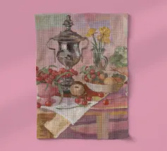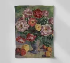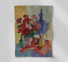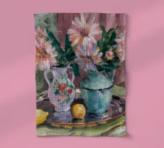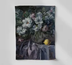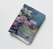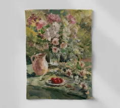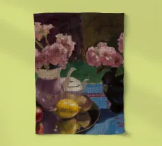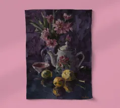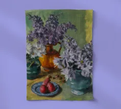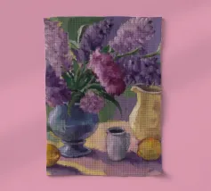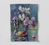 Una natura morta con una brocca d'argento riempita con un rigoglioso bouquet di lillà viola e rosa. Un bicchiere di vino rosso e della frutta si trovano su una superficie scura e lucida che riflette gli oggetti.