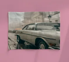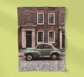 In una pittoresca strada di Londra, un'elegante auto d'epoca passa davanti a facciate di mattoni con un'atmosfera retrò e senza tempo dell'architettura britannica, mescolando storia e nostalgia urbana.
