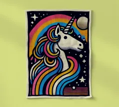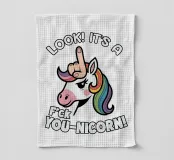 Un unicorno stravagante con una criniera arcobaleno mostra un'espressione sfrontata mentre alza una mano in un gesto giocoso. Intorno all'unicorno ci sono elementi di testo in grassetto che aggiungono un tocco comico.