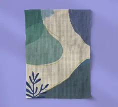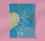 Un disegno botanico minimalista presenta un ramo bianco delineato con foglie. Linee curve e forme organiche nei toni del blu, del verde e del giallo creano uno sfondo moderno e astratto.