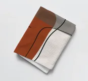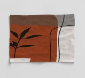 Il design minimalista è caratterizzato da una semplice pianta in vaso con foglie scure, contrapposta a forme astratte e sovrapposte nei toni terrosi del rosso, del grigio e del bianco. Le linee pulite e i blocchi di colore decisi creano un'estetica moderna e rilassante.