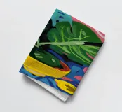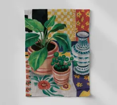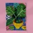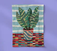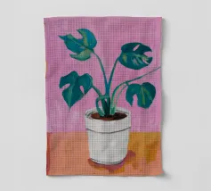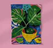Una vivace natura morta di una pianta di monstera in un vaso giallo, su uno sfondo di motivi astratti e colorati. La composizione è un mix vivace e giocoso di forme naturali e design moderno.