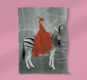 Dipinto vintage di una donna in elegante abito rosso che cavalca la sua zebra verso l'orizzonte al tramonto. Collage a tecnica mista di MsGonzalez
