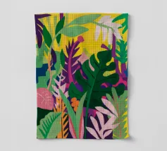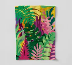 Una lussureggiante scena di giungla incornicia un grappolo d'uva viola, creando una natura morta unica e inaspettata che fonde il fogliame tropicale con la frutta del frutteto in una composizione vibrante.