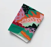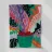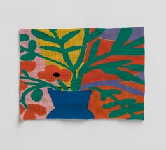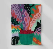 Una composizione astratta presenta una ciotola di fragole in mezzo a un turbinio di forme e motivi organici e colorati, creando un'interpretazione fresca e moderna di un classico dell'estate.