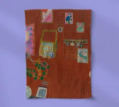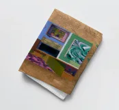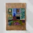 Un'opera d'arte simile a un collage presenta una collezione di dipinti in miniatura incorniciati, diversi motivi ed elementi di natura morta, disposti su uno sfondo strutturato, forse in legno, dalle molteplici tonalità.