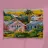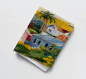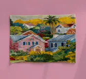 Un villaggio di case colorate di rosa, blu e giallo è adagiato sul fianco di una collina; la scena è composta come un'allegra trapunta patchwork di colori e forme, che emana un senso di comunità e gioia.