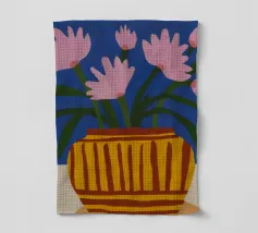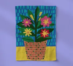 Un vaso a righe bianche e blu contiene fiori gialli e rosa, su uno sfondo vibrante, simile a una trapunta, con motivi floreali rosa, arancioni e rossi.