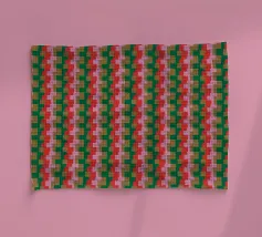 Un motivo ripetuto di linee diagonali e forme geometriche in vari colori. Il disegno utilizza tonalità audaci e contrastanti per creare un effetto visivo vibrante.