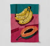 Un'illustrazione audace e ispirata alla pop art di banane e papaya su un piatto rosso brillante. I colori ad alto contrasto e lo stile grafico creano una dichiarazione vibrante e giocosa.
