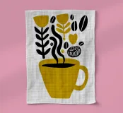 Questa composizione giocosa abbina il caffè alle sue origini botaniche. La ridotta combinazione di colori bicolore, giallo senape caldo e nero intenso, ricorda le illustrazioni scandinave della metà del secolo scorso. Piante di caffè stilizzate, chicchi danzanti e forme di foglie decorative spuntano allegramente dalla tazza dorata: una visualizzazione poetica della filosofia farm-to-cup. L'estetica serigrafica bidimensionale e il linguaggio ingenuo del design conferiscono all'opera un fascino artigianale. Perfetta per la cucina, per le pareti dei bar e per tutti coloro che non vogliono solo bere il caffè, ma vogliono celebrarne l'intera storia.
