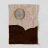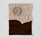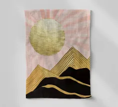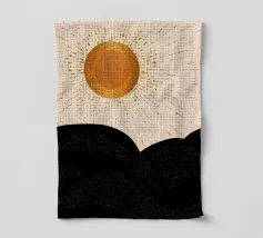 Splendido paesaggio astratto dall'effetto metallico, con un sole brillante in argento e oro con raggi solari disegnati con punti grigi e bianchi e colline scintillanti in marrone, su uno sfondo beige.
