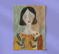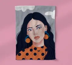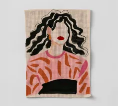 Il dipinto raffigura una persona con capelli corti e scuri acconciati a onde, che indossa un abito con motivi retrò e cerchi e diamanti nei toni del rosa, del marrone e del beige. Lo sfondo è di un semplice colore beige chiaro.