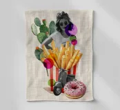 Un collage giocoso e retrò che fonde l'estetica vintage con la cultura pop: una ragazza degli anni '60 in bianco e nero con occhiali tondi e sciarpa si trova di fronte a un cactus mediterraneo, un cono gigante di patatine fritte, una Vespa nera e una ciambella rosa con zuccherini colorati. La composizione è arricchita da audaci cerchi di colore in stile grafico. Perfetta per gli spazi creativi, le cucine moderne o gli interni degli amanti della pop art.