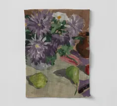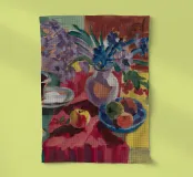 Una sontuosa natura morta presenta una teiera d'argento, una tazza di tè, una ciotola di frutta, tra cui mele e bacche, e un vivace bouquet di fiori, tutti riccamente colorati e strutturati, su un tavolo.