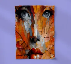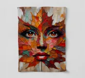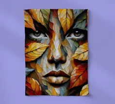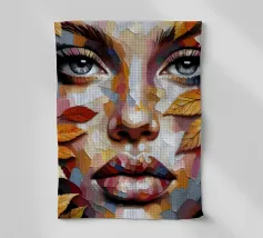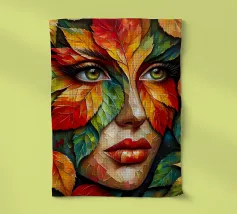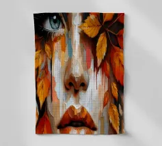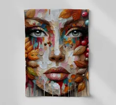 Ritratto in acrilico di un volto di donna su una foglia.