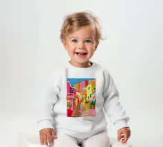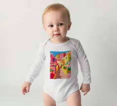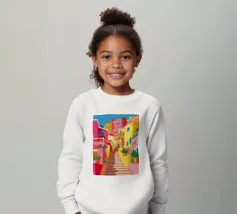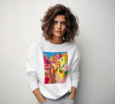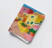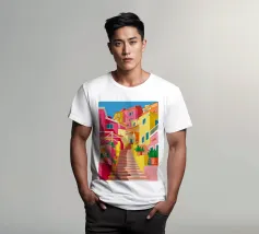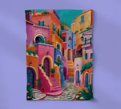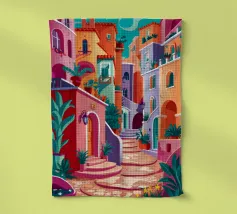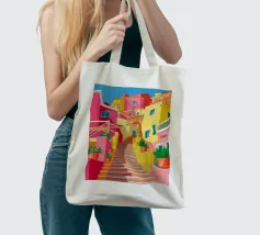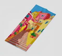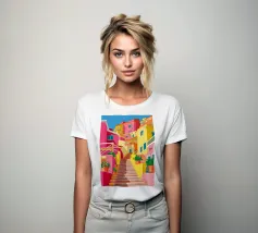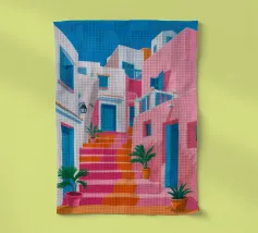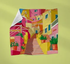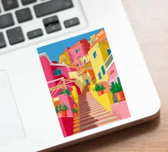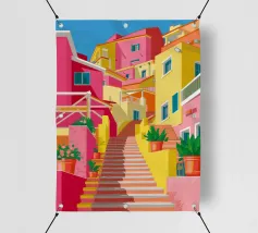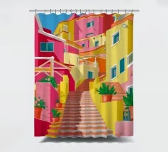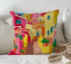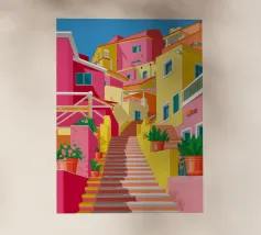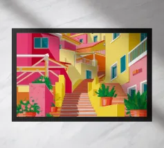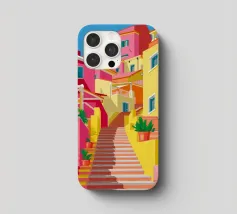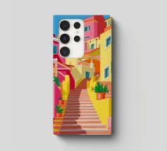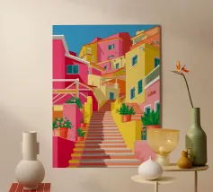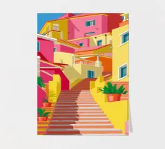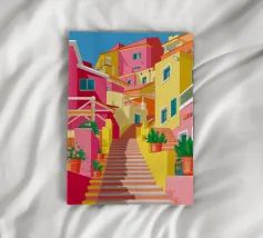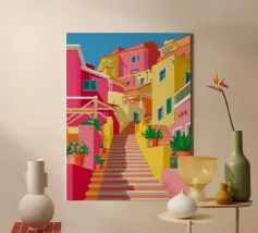 Una ripida scalinata colorata funge da strada in una città mediterranea, fiancheggiata da edifici di colore giallo, arancione e rosa, ornati da piante verdi in vaso.