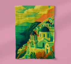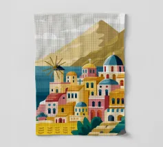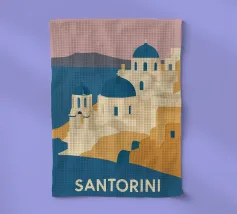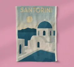 Design di viaggio minimalista della Grecia con le famose case bianche dell'isola greca di Santorini, le rocce vulcaniche e il blu del Mar Mediterraneo. Tipiche case graziose come nei villaggi di Oia e Fira.