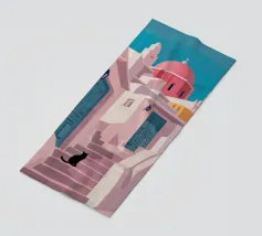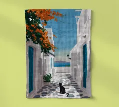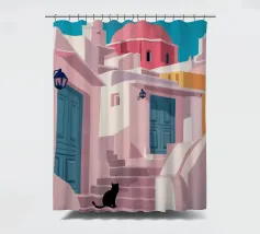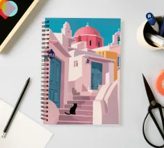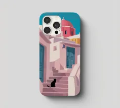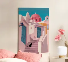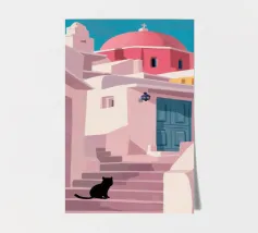 Un gatto nero si sofferma sugli iconici gradini imbiancati di Santorini, con la famosa chiesa a cupola rossa e il mare blu sullo sfondo, catturando un momento di pace della vita dell'isola greca.
