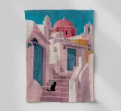 Un gatto nero si sofferma sugli iconici gradini imbiancati di Santorini, con la famosa chiesa a cupola rossa e il mare blu sullo sfondo, catturando un momento di pace della vita dell'isola greca.
