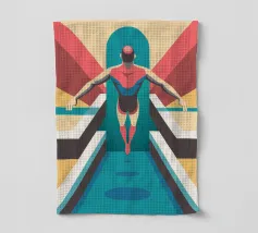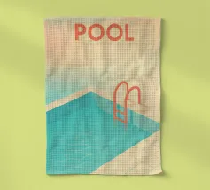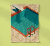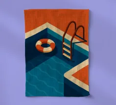 Poster raffigurante una piscina estiva con una scala arancione e riflessi d'acqua stilizzati. Un gioco di ombre, luci grafiche e una tavolozza solare. Perfetto per un look vintage e rinfrescante.