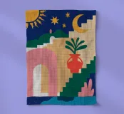 Una scena d'interni stravagante e astratta con una scala rosa, piante in vaso e un sole e una luna nel cielo visti attraverso un arco. L'opera d'arte è un paesaggio da sogno giocoso e bohémien.
