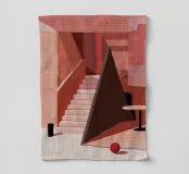 Un'imponente scalinata domina uno spazio interno reso interamente in toni di rosa, salmone e terracotta, creando una scena calda, monocromatica e lunatica.