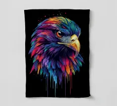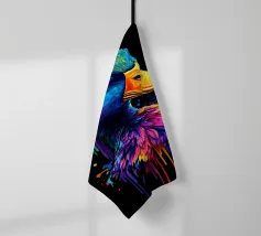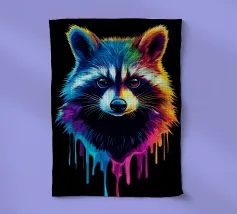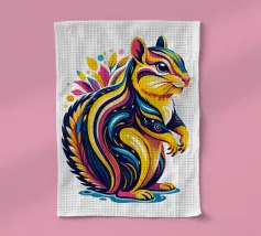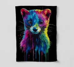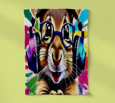 Uno scoiattolo curioso si affaccia vivacemente dal quadro, raffigurato con colori intensi e brillanti su uno sfondo nero. La tavolozza dei colori spazia dal blu intenso e dal rosa brillante al giallo caldo e al rosso vibrante. I passaggi sono fluidi e ricordano le pennellate, mentre singoli schizzi e gocce di colore conferiscono al motivo un effetto dinamico, quasi esplosivo. L'animale appare vigile e vivace, con dettagli finemente lavorati nella sua pelliccia e un grande occhio lucido che guarda direttamente lo spettatore.