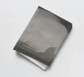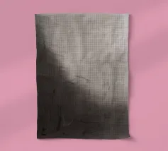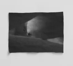 Una rappresentazione monocromatica presenta una forma accartocciata che ricorda in qualche modo una montagna o una formazione rocciosa. Le ombre e le lumeggiature sono state utilizzate per dare alla forma un aspetto tridimensionale, e poggia su uno sfondo più scuro che ne esalta la silhouette.
