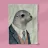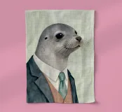 Ritratto realistico ad acquerello di una foca aggraziata vestita con un abito scuro, un gilet color ruggine e una cravatta a righe verde acqua su un morbido sfondo color menta pastello.