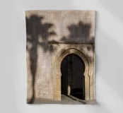 Ombra di una palma botanica su un muro color pastello a Rabat. Fotografia di strada in Marocco. Antico muro di cinta nella capitale Rabat.