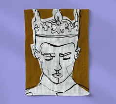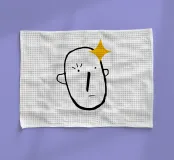 Un volto semplicistico e astratto è disegnato con linee nere decise e presenta una stella gialla sulla fronte. L'espressione è minimale, con piccoli punti per gli occhi e una linea retta per la bocca.