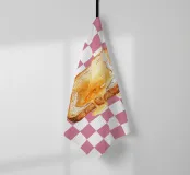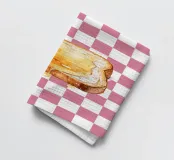Una fetta di pane tostato è ricoperta da una generosa quantità di miele, la cui tonalità dorata contrasta con lo sfondo rosa e bianco a scacchi. La composizione, semplice ma vivace, mette in risalto la dolcezza appiccicosa del miele che brilla sotto la luce.