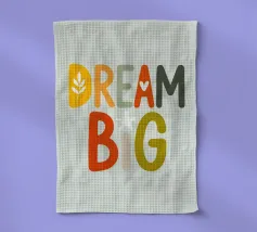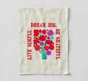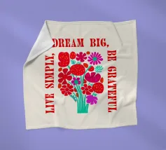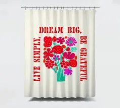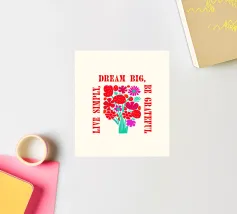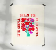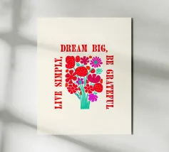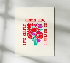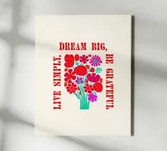 Questa opera d'arte vibrante ed edificante presenta un colorato bouquet di fiori con il messaggio ispiratore "Dream Big, Be Grateful, Live Simply" scritto in grassetto a caratteri rossi. I fiori sono disegnati in uno stile allegro e stravagante, con una varietà di forme e colori. Questa opera d'arte è perfetta per aggiungere un tocco di positività e gioia a qualsiasi spazio.