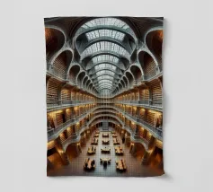 Una struttura architettonica surreale con caratteristiche curve e distorte, che fonde stili classici e moderni, si erge sotto un cielo blu brillante. La strada di ciottoli e la luce soffusa del sole esaltano l'atmosfera stravagante e onirica.